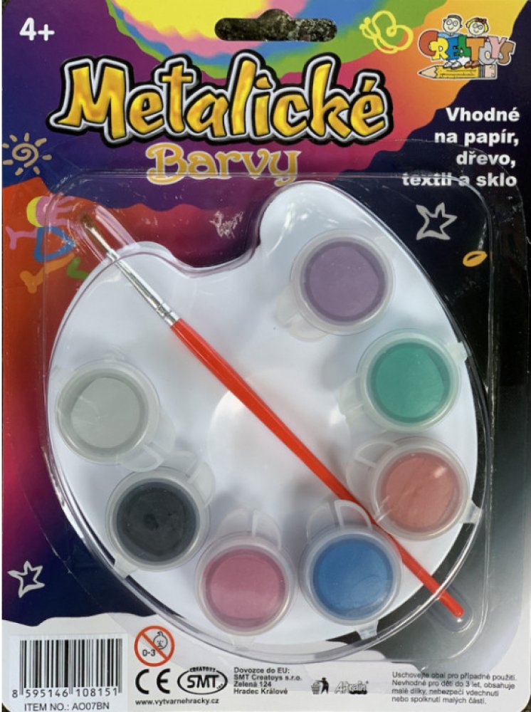 Obsahuje 7 metalických akrylových barev , paletu a štětec.