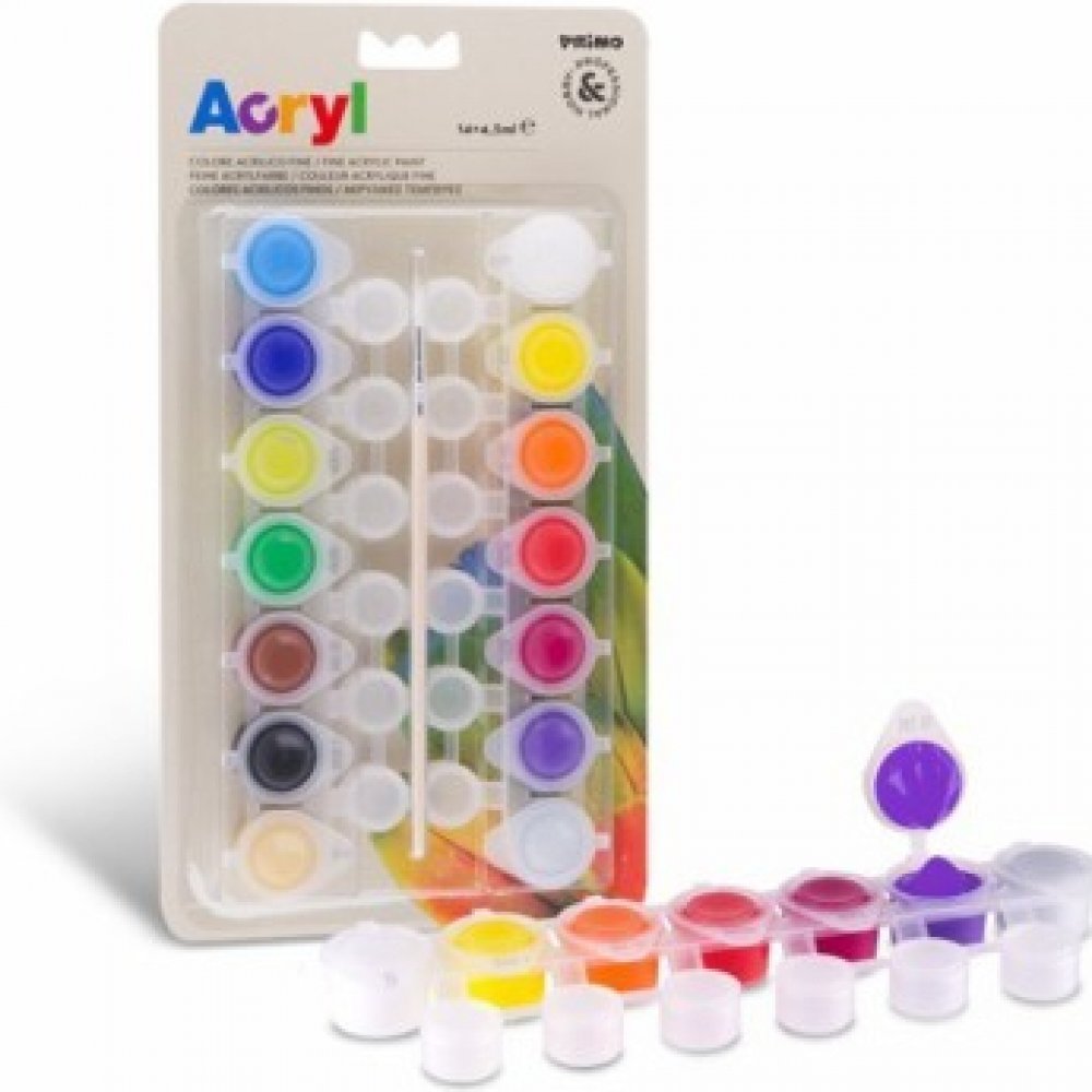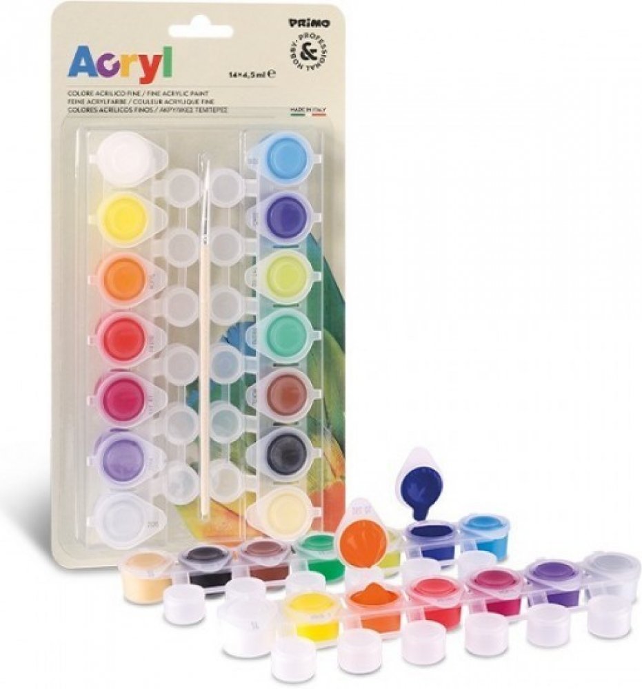 Akrylové barvy Primo na akrylové bázi s vysokým obsahem pigmentu a výbornou krycí schopností. Ředitelné vodou. Vhodné pro jakýkoliv druh podkladu dřevo, kov, keramiku nebo i pro techniku decoupage- ubrouskové techniky, jsou nesmyvatelné a odolné vodě. Na blistru 14 odstínů barev po 4,5ml v uzavíratelném kelímku s míchací nádobkou u každého odstínu.