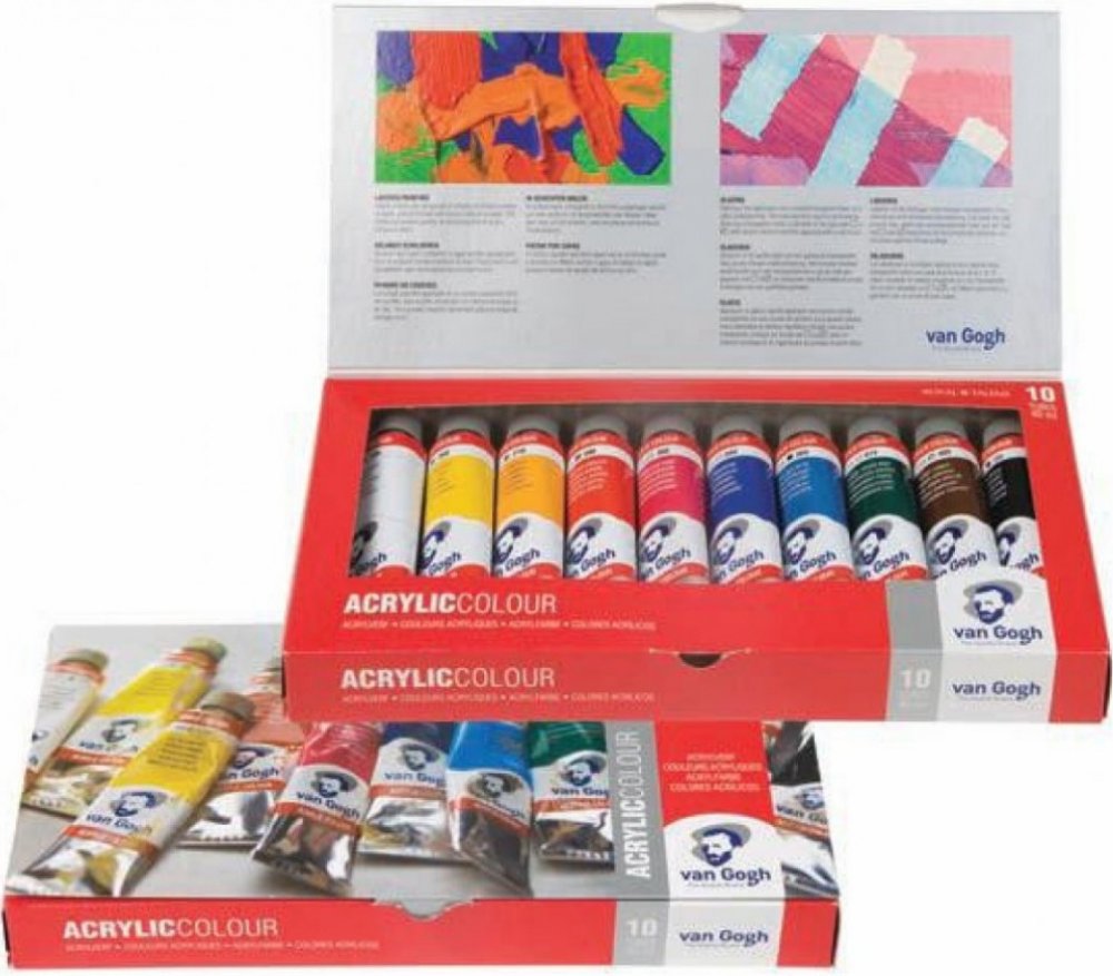 Van Gogh akrylové barvy - set 10 x 40 ml. Sada kvalitních olejových barev Royal Talens Van Gogh.Tyto barvy se riedi terpantýnem, alebo White Spiritom. Štetce je potreba po pojižití ihneď opláchnuť vlažnou vodou.Pojižíváme tiež mýdlo.Po zaschnutí nejdú akrylové barvy vyprať!