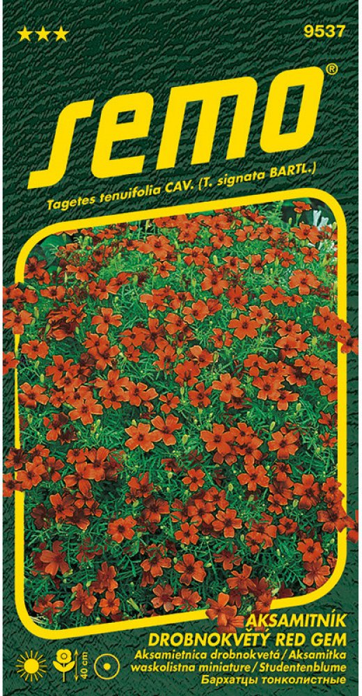 Aksamitník drobnokvětý červený - letnička s jemně vykrajovanými listy tvoří polštářovité bochánky bohatě kvetoucí po celý rok je používaná především na záhony a obruby. Lze použít i do truhlíků a nádob. Odrůda doplňující kolekci drobnokvětých aksamitníků o nejtmavší barvu. Neobvyklá červená odrůda bohatě kvetoucí až do zámrazu, výška 30 – 40 cm.