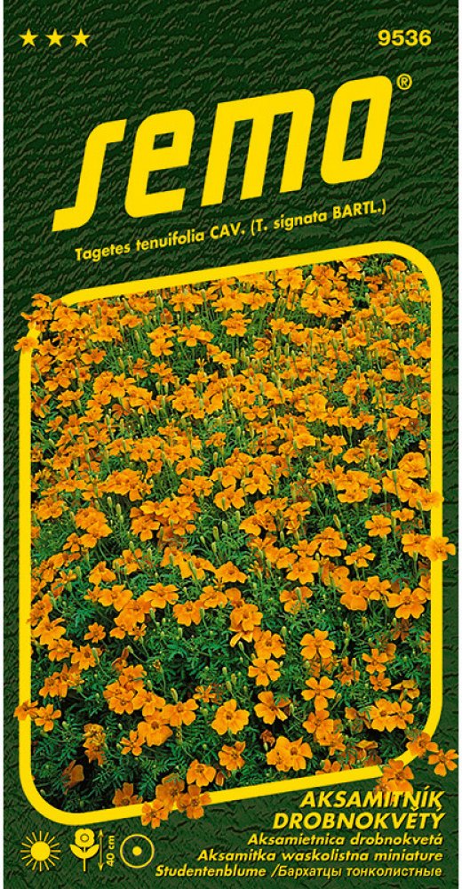 Aksamitník drobnokvětý oranžový - letnička s jemně vykrajovanými listy tvoří polštářovité bochánky bohatě kvetoucí po celý rok, je používaná především na záhony a obruby. Lze použít i do truhlíků a nádob. Neobvyklá oranžová odrůda bohatě kvetoucí až do zámrazu, výška 30 – 40 cm.
