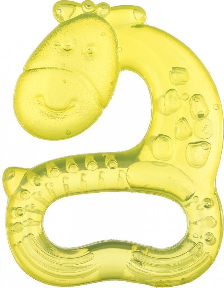 Roztomilé kousátko ve tvaru žluté žirafy naplněné chladivou vodou. Kousátko je opatřeno hrbolky, které uleví podrážděným dásním vašeho děťátka, a velký otvor uprostřed usnadňuje uchopení malými ručičkami.