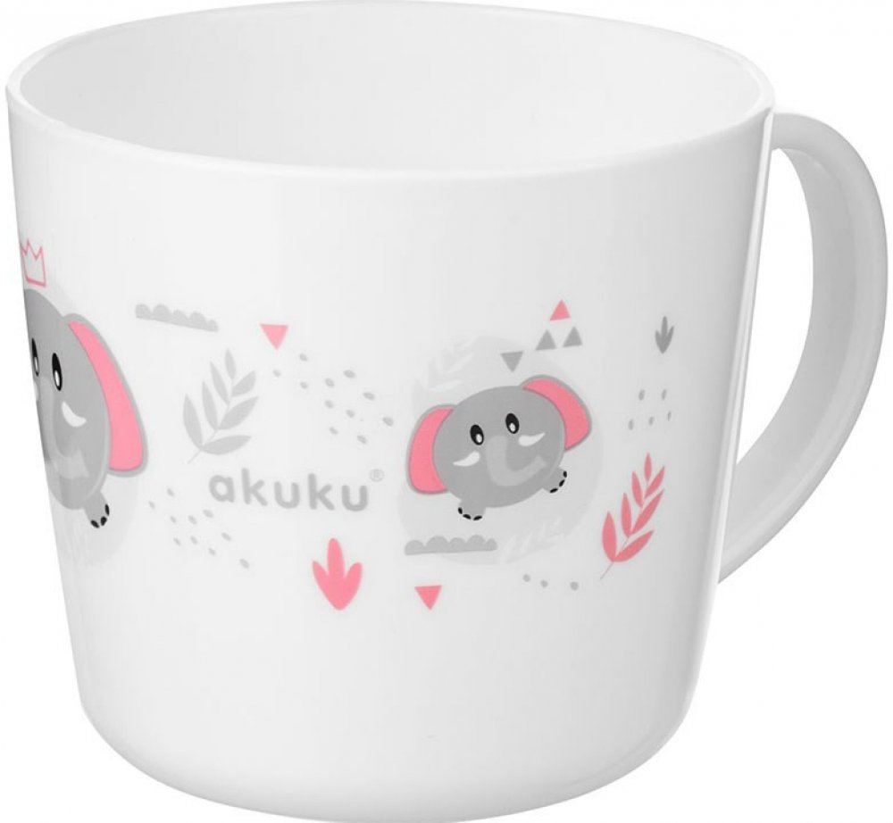 Akuku - Akuku Hrníček s ouškem Slůně - 12 m+, bílý s potiskem - Velmi lehký hrníček zdobený Slůnětem. Vyrobeno z bezpečných materiálů určených pro styk s potravinami.