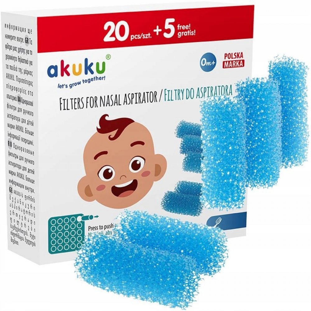 Vyměnitelné filtry pro nosní odsávačku AKUKU, které zabraňují vniknutí sekretu z nosu do trubičky s náustkem a tím zabraňují infekci osoby čistící nos dítěte. Jsou nezbytné pro správný a hygienický provoz odsávačky. Zachycují nosní sekret v zařízení a chrání ošetřovatele dítěte před infekcí.