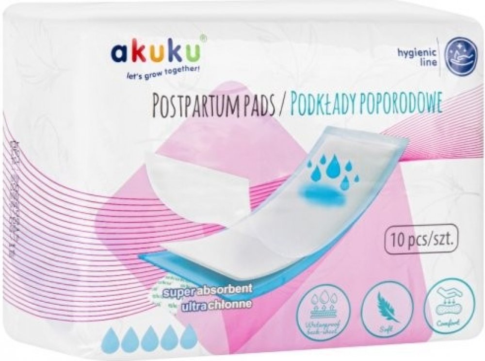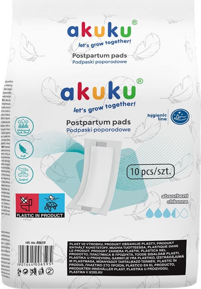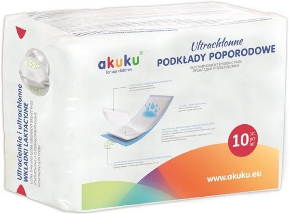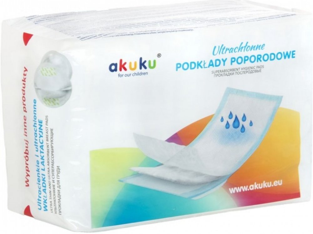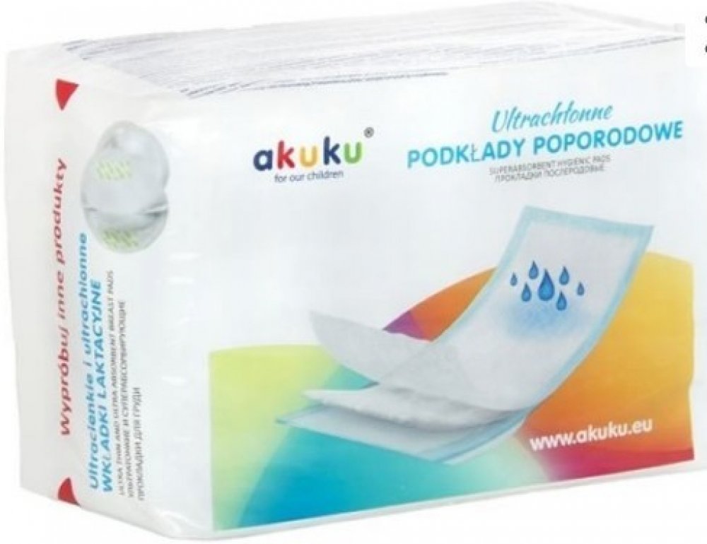 Jednorázové hygienické poporodní vložky Akuku jsou určeny všem maminkám, které se chtějí cítit pohodlně v období porodu. Vložky mají jemnou a měkkou vnitřní vrstvu, která poskytuje kvalitní ochranu oblečení ve stoje i v leže a zabraňují podráždění pokožky. Mají vysoce prodyšnou vrchní vrstvu, která zajišťuje přísun vzduchu, takže maminka má pocit svěžesti.