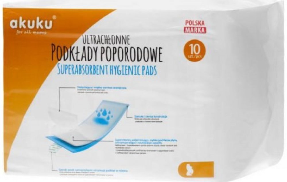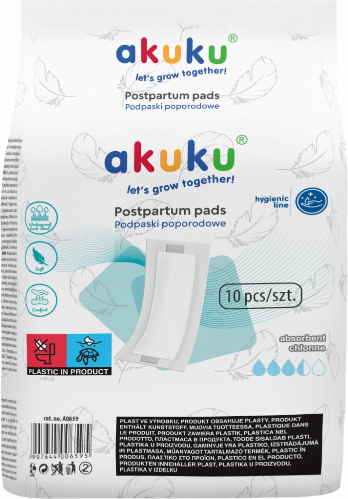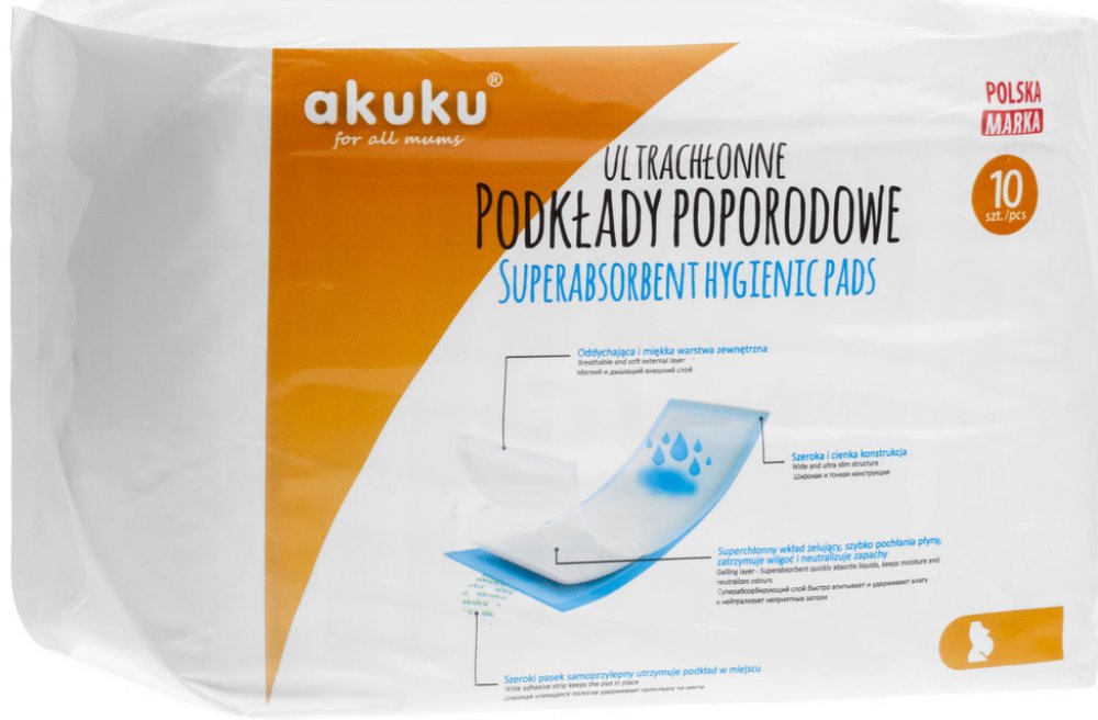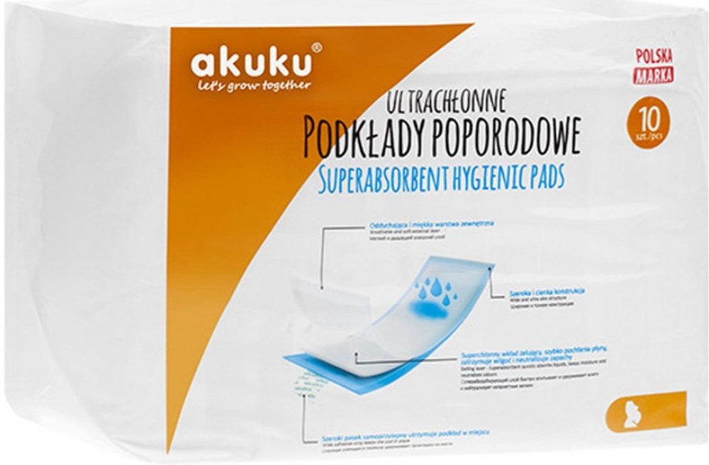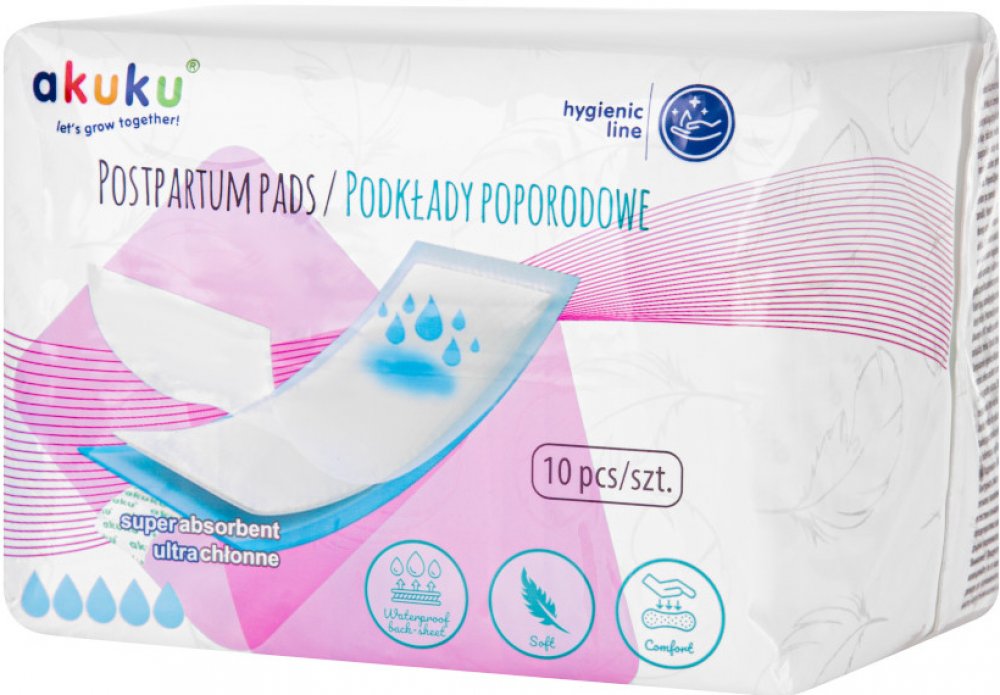 Jednorázové hygienické poporodní vložky Akuku jsou určeny všem maminkám, které se chtějí cítit pohodlně v období porodu. Vložky mají jemnou a měkkou vnitřní vrstvu, která poskytuje kvalitní ochranu oblečení ve stoje i v leže a zabraňují podráždění pokožky. Mají vysoce prodyšnou vrchní vrstvu, která zajišťuje přísun vzduchu, takže maminka má pocit svěžesti.