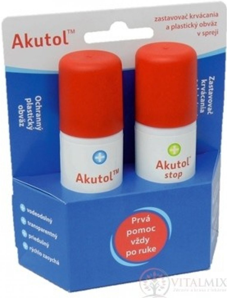 Akutol spray je plastický obvaz na bázi akrylátového kopolymeru, který slouží k rychlému ošetření oděrek a drobných ran (v domácnosti, při zahradničení, při práci v zemědělství nebo při sportu). Po nanesení vytváří vodě odolnou ochrannou vrstvu, zabraňuje přístupu mikroorganizmů ze zevního prostředí. Zasychá již do 2 minut. K odstranění obvazu dojde samovolně po 3-4 dnech postupně, probíhajícím zeslabením plastické vrstvy jejím odíráním při běžně prováděných činnostech.