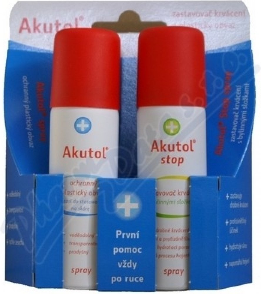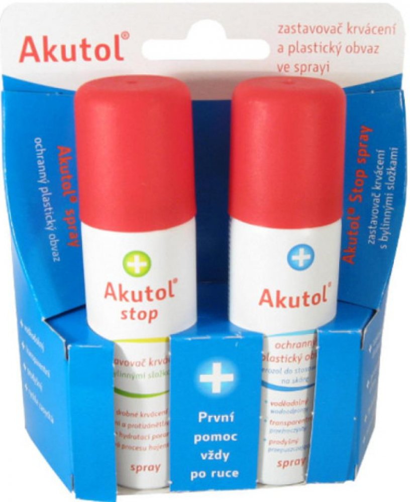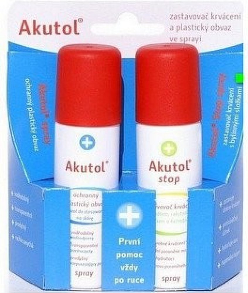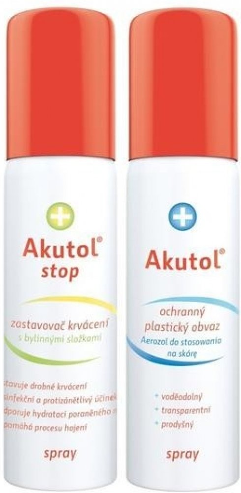 Akutol Stop spray je zastavovač krvácení obsahující bylinné složky (aloe, rakytník, heřmánek, měsíček). Mořské a bylinné složky ránu zklidní a hydratují. Přípravek slouží k ošetření drobných povrchových poranění. Vytváří nad poraněním práškovou vrstvu, která z poraněného místa absorbuje krev za vzniku chladivého hydrogelu.