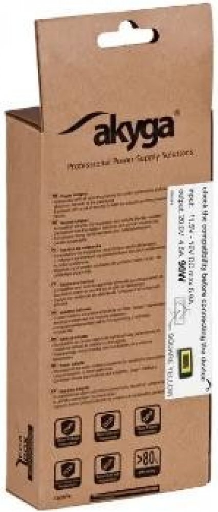Značka Akyga produkuje širokou škálu výkoných a kvalitních vyhrazených zdrojů pro napájení notebooků a jiných zařízení. Kabel napájecího adaptéru je vybaven vysoce kvalitním feritovým jádrem, které chrání zařízení před vysokofrekvenčním šumem v jakémkoliv proudovém režimu. Sada ochranných prvků (OVP, OTP, OPP, SCP a OCP) zaručuje 100% bezpečnou a stabilní práci s napájeným zařízením i napájecím zdrojem. Vysoká účinnost nad 80% zajišťuje efektivní napájení. Dodatečná bezpečnost pro zařízení je zajištěna technologií soft startu, která při spouštění zařízení neutralizuje prvotní proudový náraz. Všechny napájecí zdroje společnosti Akyga jsou baleny v ekologicky šetrném balení typu Ecobox.