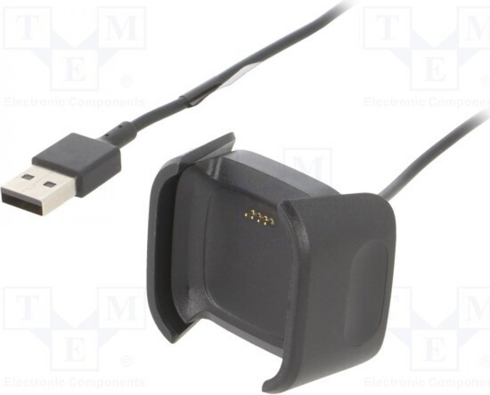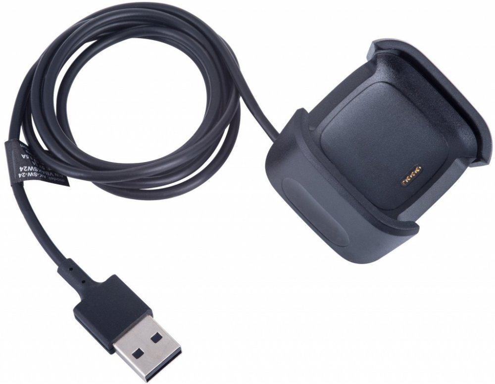 Nabíjecí kabel pro chytré hodinky Fitbit Versa 2. Chytré hodinky se velmi snadno zapojují do nabíjecí zásuvky. To vše díky výklopným stěnám nabíječky, které chrání chytré hodinky před náhodným poškozením při připojování. K dispozici je univerzální konektor USB, díky kterému si můžete vybrat, zda ji připojíte k síťovému adaptéru, powerbance, nebo notebooku. Jediné požadavky na zdroj napájení jsou 5 V / 1 A.