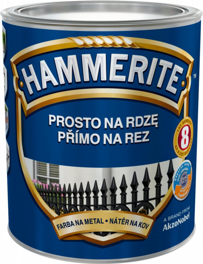 Hammerite Přímo na rez, hladký se může aplikovat na: - Brány a ploty - Garažové vrata - Kovové dekorace, nádoby, květináče a lampy - Zábradlí - Zahradní nábytek Vlastnpsti produktu. Doba schnutí: Suchý na dotyk 2h, brousitelný/druhý nátěr 6h, proschlý 6h Druh aplikace: email/vrchní barva 3v1