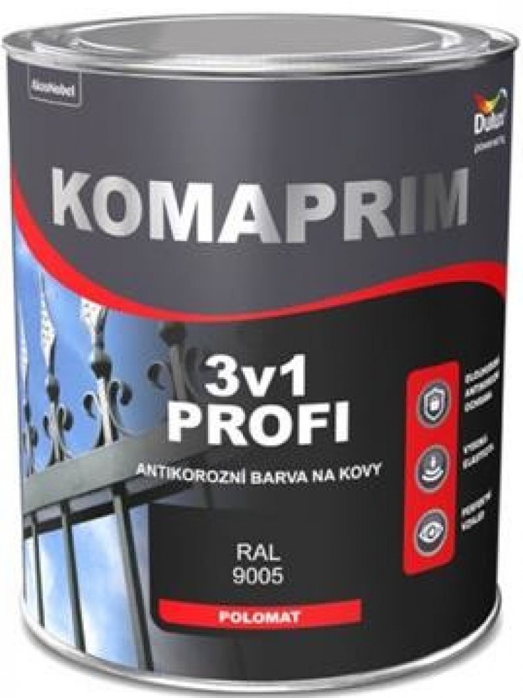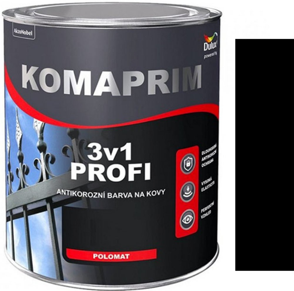 Akzo Nobel Komaprim 3v1 Profi RAL9005 černá polomat 0.75l Komaprim 3v1 Profi je syntetická barva 3v1 (základ, mezinátěr a vrchní email) s výborným antikorozním účinkem (bariérový a inhibiční efekt). Barva je určena jak pro vnitřní, tak vnější použití, a to na ocel, zoxidovanou pozinkovanou ocel nebo železo. Hodí se na ocelové konstrukce, kontejnery, strojní součásti, střechy, brány, sloupy atp. Dobře odolává vlhkosti. Neobsahuje těžké kovy. Výsledný film má pololesklý vzhled. Pro vnější a vnitřní použití a bez použití základové barvy, dlouhodobý antikorozní účinek