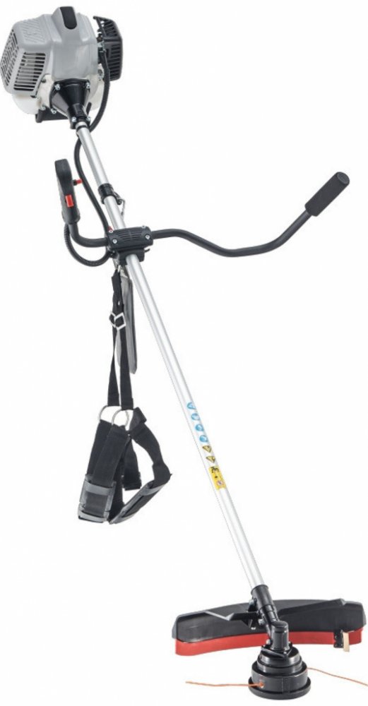 Součástí balení je trojzubý ocelový kotouč, strunová poloautomatická hlava a dvojité popruhy.