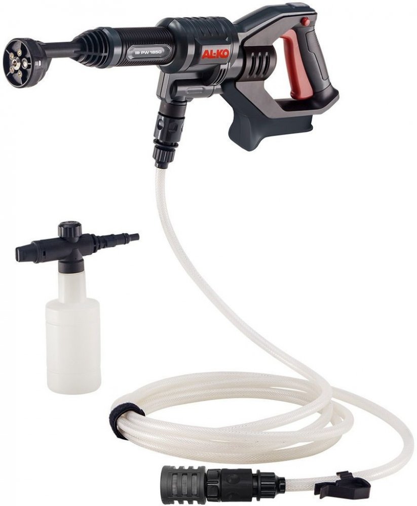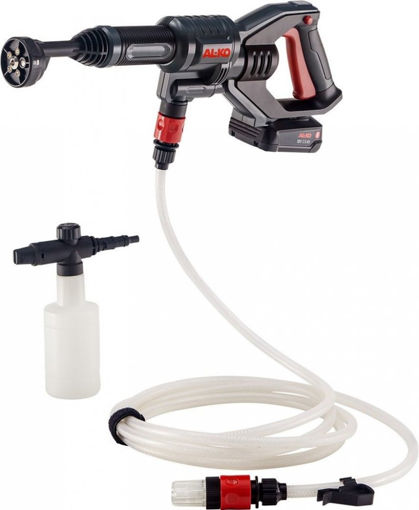 Pro vaši bezpečnost: ochrana akumulátoru silikonovým krytem. Sací hadice o délce 6 m umožňuje nasát vodu na čištění i ze vzdálených vodních zdrojů. Díky vodním tryskám 5 v 1 včetně stupně zavlažování rostlin je k dispozici 5 šířek paprsku. Součástí dodávky je montážní nádobka na saponát.