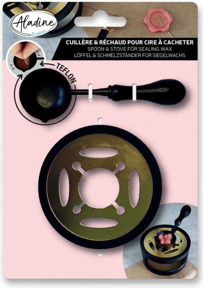 Teflonová sada k rozehřátí pečetních vosků ve formě granulí na výrobu pečetí, kterými ozdobíte svatební oznámení, pozvánky, chlopně obálek, dárky i kreativní projekty. Stojánek se lžičkou se umístí nad zapálenou čajovou svíčku. Do lžičky se vloží 3–4 granule vosku, použít lze různé barvy pro mramorovaný efekt. Po roztavení se vosk ze lžičky nalije na požadované místo, vtiskne se do něj kovové peče...