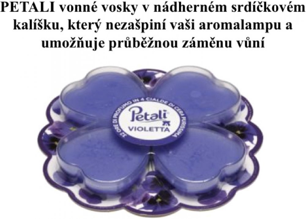 Svěží fialka Vám připomene vůni dětství a venkova. Patentovaný systém vonných vosků PETALI v kalíšku, které nezašpiní Vaši lampu. Řada PETALI, to je patentovaný systém aromalampy a vonných vosků v překrásných srdíčkových kalíšcích, které nezašpiní Vaši lampu.