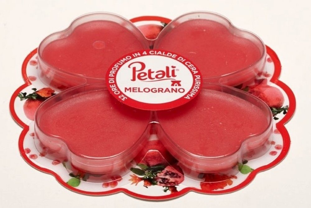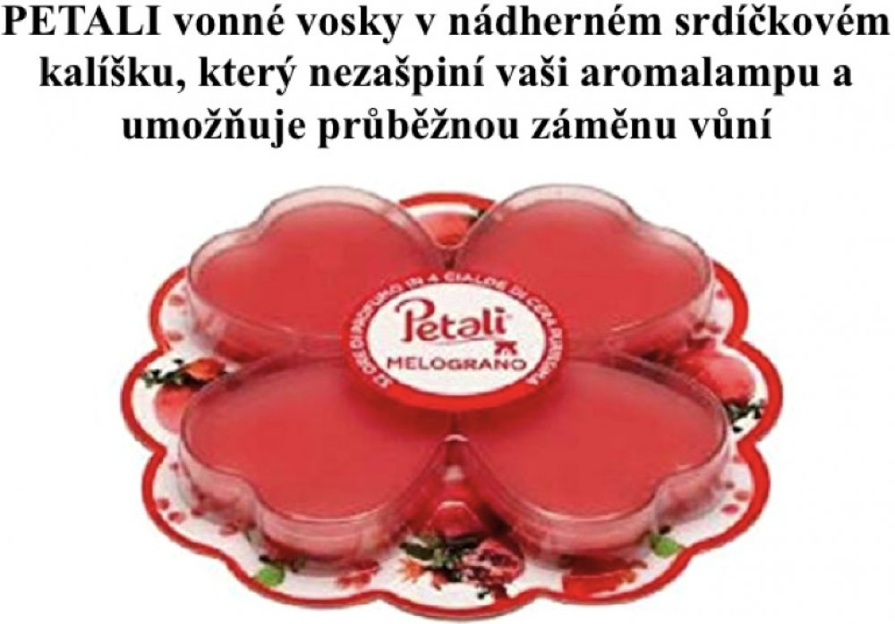 Příjemná a originální vůně granátového jablka provoní Váš byt v jakémkoliv ročním období. Patentovaný systém vonných vosků PETALI v kalíšku, které nezašpiní Vaši lampu. Řada PETALI, to je patentovaný systém aromalampy a vonných vosků v překrásných srdíčkových kalíšcích, které nezašpiní Vaši lampu.