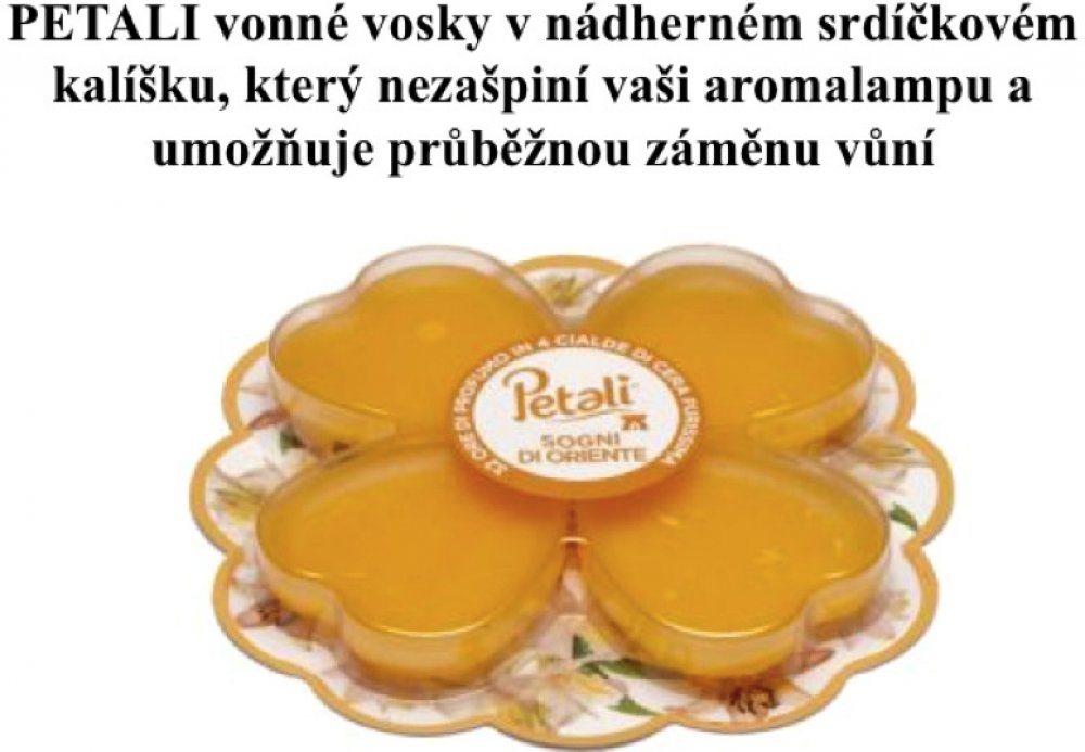 Smyslná vůně orientálních nocí Vás přesune do oblasti vezírů, šehrezád a zlata. Patentovaný systém vonných vosků PETALI v kalíšku, které nezašpiní Vaši lampu. Řada PETALI, to je patentovaný systém aromalampy a vonných vosků v překrásných srdíčkových kalíšcích, které nezašpiní Vaši lampu.