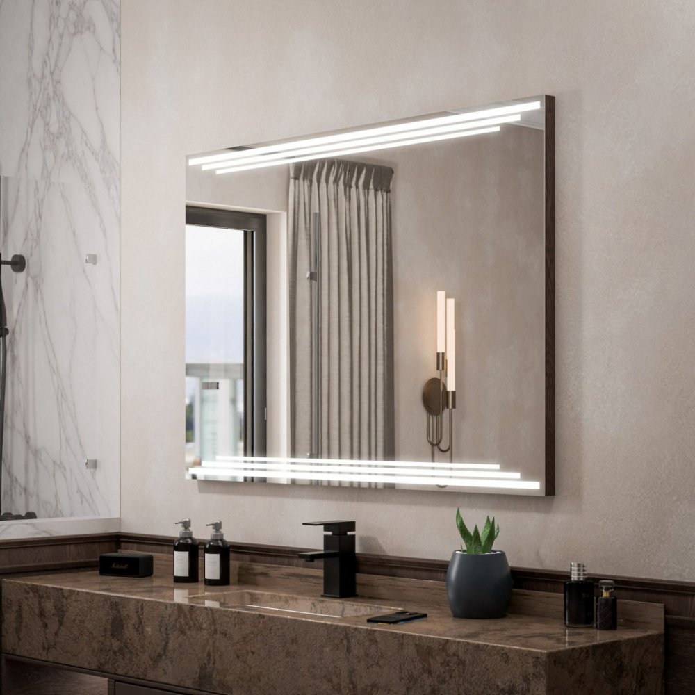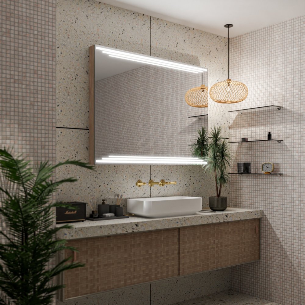 LED zrcadlo v dřevěném rámu | Objevte nový rozměr dekorace s naším LED zrcadlem, vybaveným vysoce kvalitní zrcadlovou deskou AGC MIROX o tloušťce 4 mm, která zajišťuje jasný odraz. Pevný dřevěný rám o tloušťce 40 mm s elegantně broušenými hranami dodává styl každému interiéru. Přizpůsobte si své zrcadlo díky široké nabídce volitelných doplňků, jako jsou meteorologické stanice, Bluetooth reprodukto...