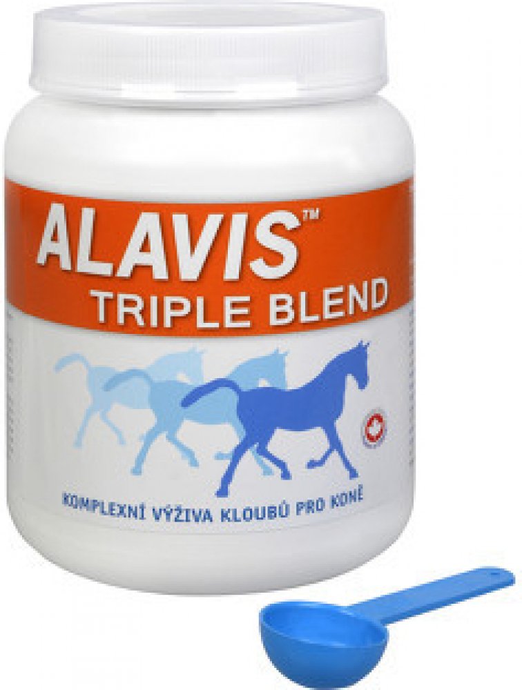 Extra silný Alavis Triple Blend je komplexní kloubní výživa pro hříbata a koně. Přípravek je určen pro regeneraci pohybového aparátu, zlepšení pohyblivosti a celkově ke zlepšení zdravotní kondice. Při pracovní a sportovní zátěži zlepšuje i fyzickou výkonnost koní. Kloubní výživa je určena pro koně všech věkových kategorií. Přípravek je vyroben na zcela přírodní bázi bez přídavku konzervantů a barviv. Alavis Triple Blend je ve formě prášku. Pro lepší přijímání zvířaty je obohacen jablečným pektinem.