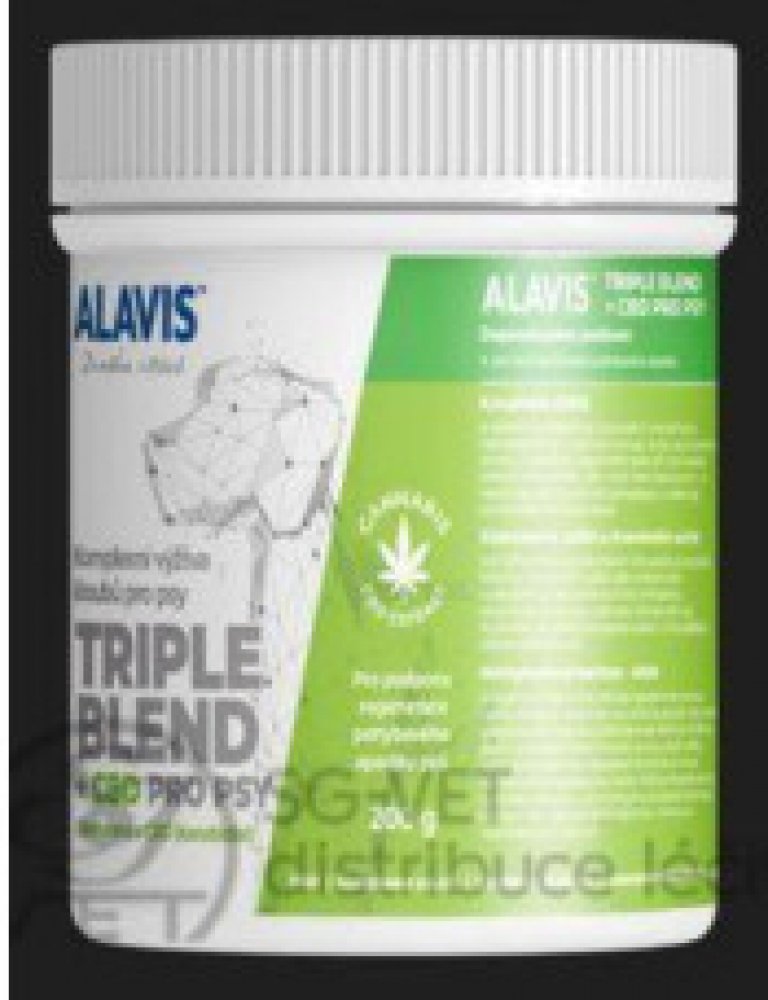 ALAVIS™ Triple Blend + CBD pro psy obsahuje látku CBD (kanabidiol) spolu s kombinací chondroprotektivních látek (glukosamin sulfátu a chondroitin sulfátu), látky MSM a značkových kolagenů a COLLYSS™ a CARTIDYSS™.