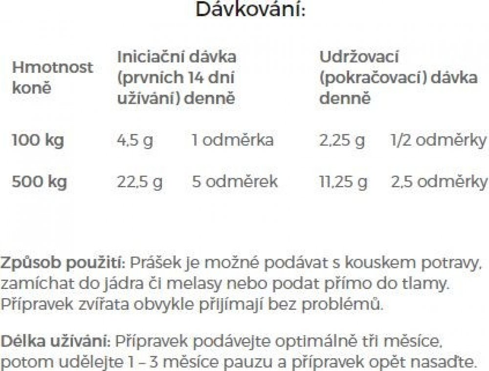 - Počet porcí v balení: Liší se dle hmotnosti koně a dávkování