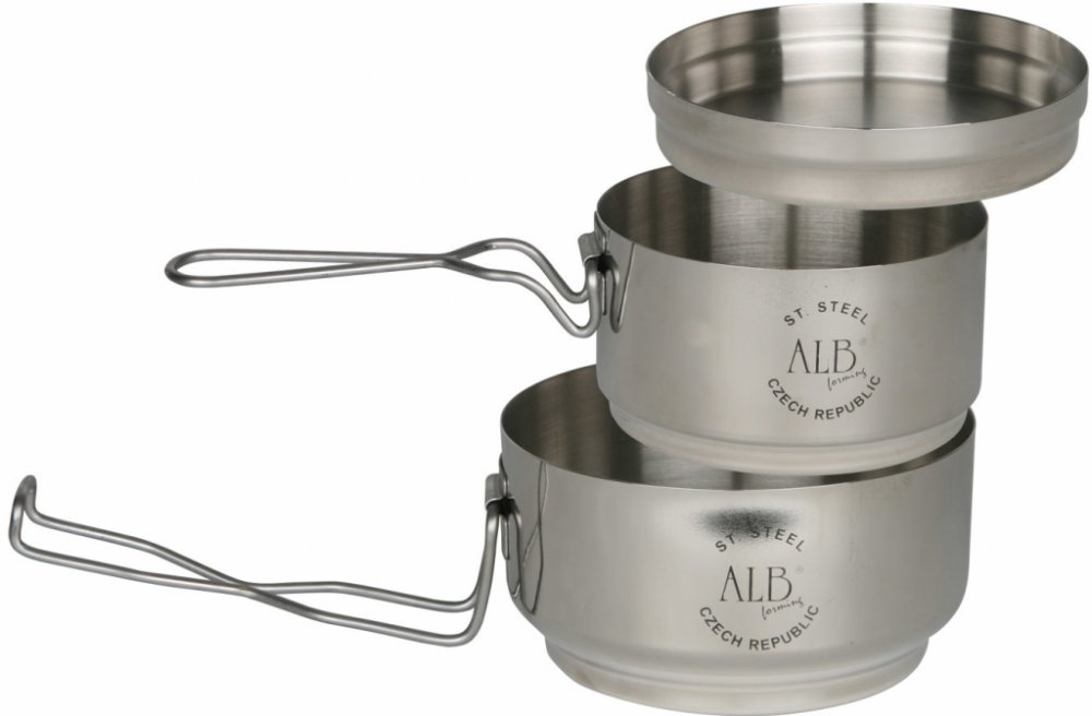Výhody sady Kvalitní nerez, díky tloušťce materiálu velice odolný Díky unikátnímu systému držadla sada drží při sobě (jako každý ešus) Velkou misku lze díky prolisu postavit na malou a vařit pokrmy současně Do malé misky se vejde většina běžně vyráběných malých kartuší Díky větší tloušťce materiálu se lépe rozvádí teplo při vaření Dlouhá životnost výrobku