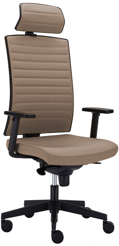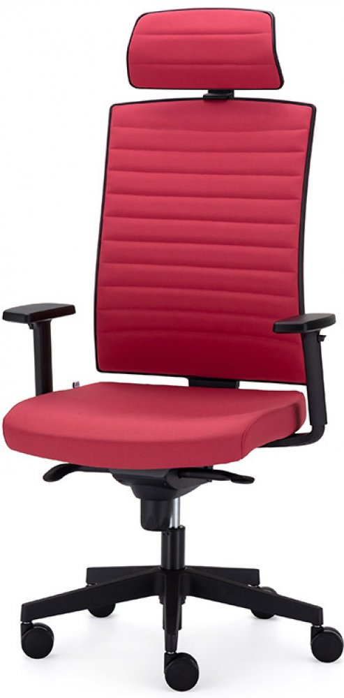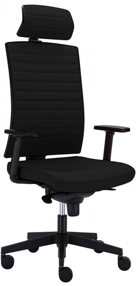 Židle do kanceláře s vysokým opěrákem a výškově stavitelnou hlavovou opěrkou, která je rovněž čalouněna textilií. Židle stojí na plastovém kříži osazeném kolečky na koberce. Chcete-li židli používat na tvrdých podlahových krytinách jako je lino, PVC, plovoucí podlaha apod. zvolte kolečka určená na tvrdé podlahy.