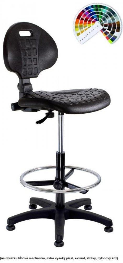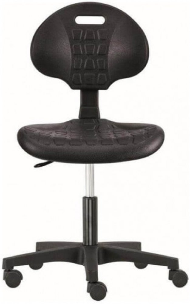 Pracovní židle, kde sedák a opěrák je tvořen z ergonomicky tvarovaného měkčeného polyuretanu černé barvy.K dispozici je mechanika kloubová. V základní variantě disponuje židlovým pístem, ale je možné použít i píst vysoký chromovaný (rozsah+19 cm) nebo píst extra vysoký chromovaný (rozsah +26 cm). Opěrný kruh není součástí. Černý plastový kříž, plynový píst a kolečka na k...
