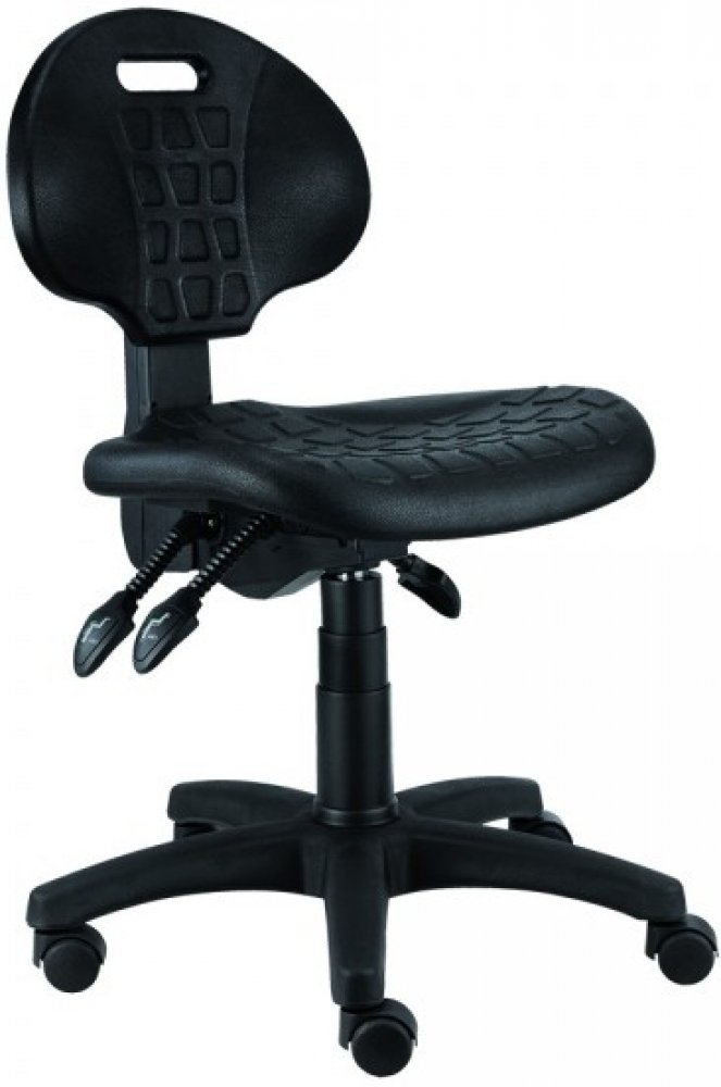 Pracovní židle, kde sedák a opěrák je tvořen z ergonomicky tvarovaného měkčeného polyuretanu černé barvy.K dispozici je mechanika kloubová. V základní variantě disponuje židlovým pístem, ale je možné použít i píst vysoký chromovaný (rozsah+19 cm) nebo píst extra vysoký chromovaný (rozsah +26 cm). Opěrný kruh není součástí. Černý plastový kříž, plynový píst a kolečka na koberec.