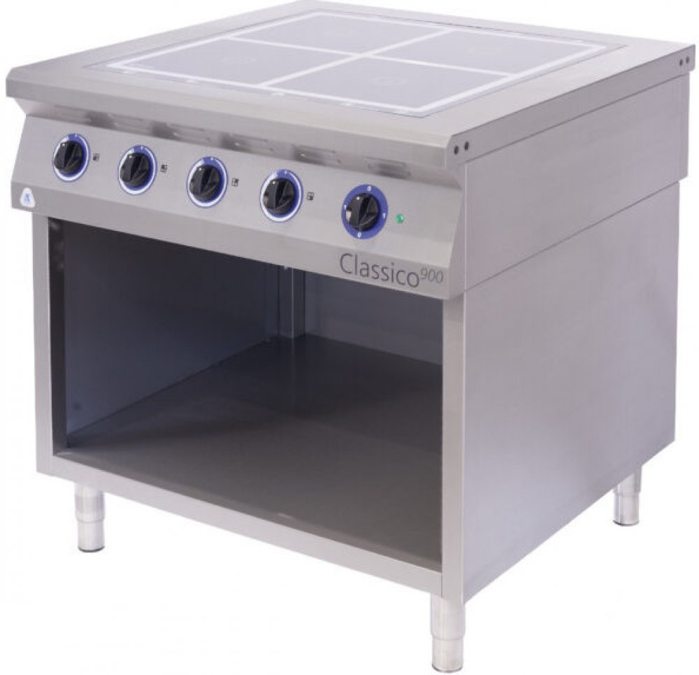 Celonerezová konstrukce z kvalitní potravinářské oceli AISI 304 - EN 1.4301. Síla varné desky - 6 mm. Plynulá regulace indukčních cívek. Kontrolka zbytkového tepla každé varné zóny. Princip indukčního ohřevu - neohřívá se deska - ohřívá se dno varné nádoby. Moderní a vysoce ekonomický způsob ohřevu - úspora energie až 80%. Samostatná vařidlová část a podstavce v několika variantách jsou opatřeny seřizovatelnými nožičkami.