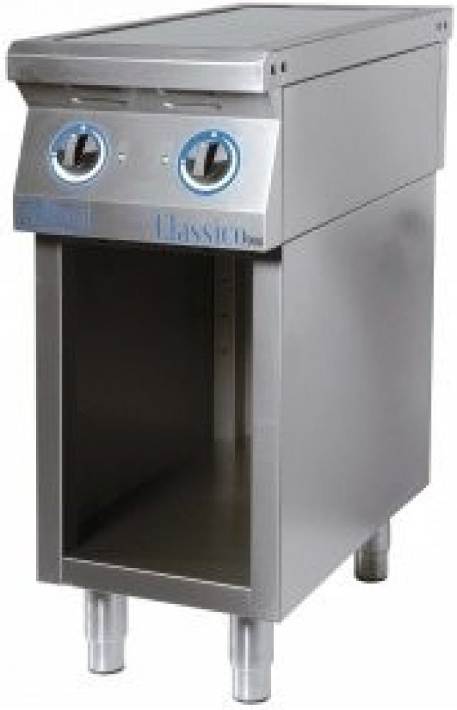 Elektrický sporák se sklokeramickou deskou E-C-TG RHB 2/900 F s volným prostorem , ALBA - deska je s rámem spojena tmelem. Topná tělesa mají plynulou regulaci teploty a jsou vybavena ochranou proti přehřátí a signalizací zapnutého stavu. Podstavce se vyrábí v několika variantách (viz.níže) a jsou opatřeny čtyřmi seřizovatelnými nožičkami.
