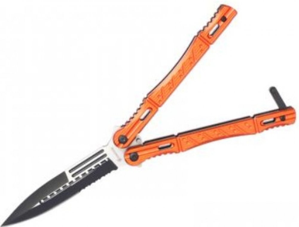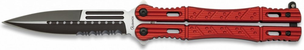 Zajímavě designově zpracovaný nůž motýlek od firmy Albainox. U tohoto typu nožů se otevření/zavření provádí překlopením dvoudílné rukojeti a zajišťuje se západkou. Tento model má výrazně tvarovanou červenou rukojeť s rýhováním a prořezávanými otvory. Rukojeť má ocelové příložky a hliníkové střenky. Čepel je vyrobena z nerezové oceli, má tvar dýky s částečně zoubkovaným ostřím, z větší části je čer...