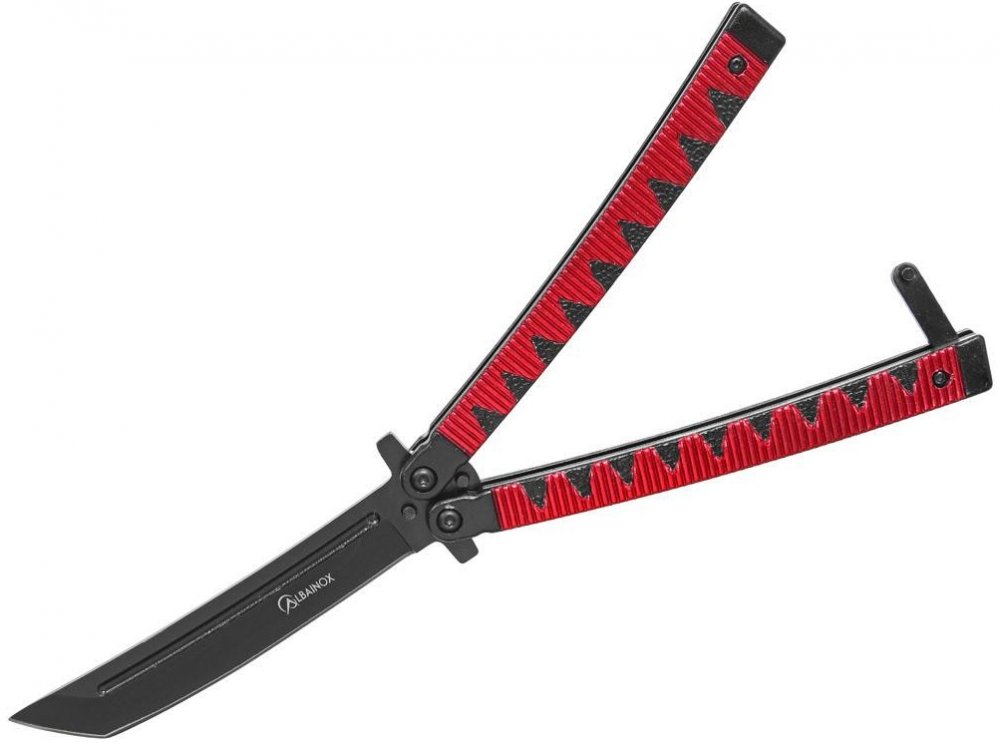 Nůž typu motýlek Albainox 36248, čepel tvaru tanto s černou povrchovou úpravou, hliníkové střenky v červenočerné barevné kombinaci, pojistná západka.