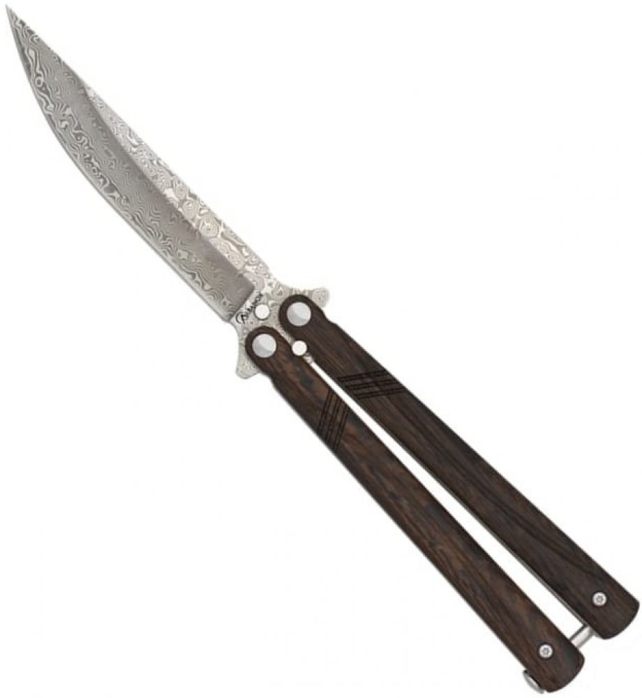 Stylově provedený balisong / motýlek s čepelí vyrobenou z damaškové oceli. -