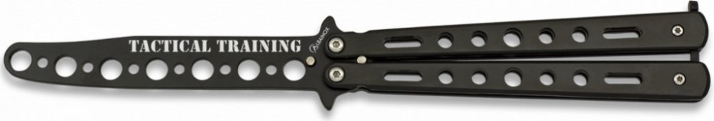 - jednoduchý zavírací nůž stylu „motýlek“, který lze ovládat jednou rukou, - uzavření nože pomocí překlopení dvoudílné rukojeti, - pojištění proti otevření pomocí tvarovaného překlápěcího kolíku, - černěná čepel bez špičky a bez ostří zabraňuje vzniku zranění při nácviku technik, - černěná rukojeť vyrobená z anodizovaného hliníku. POUŽITÍ: - nácvik technik s noži typu "buttefly/balisong".