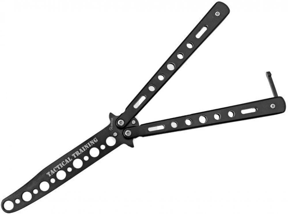 Tréninkový nůž typu motýlek Tupá čepel a zaoblená špička Ideální k bezpečnému nácviku triků Nůž je z oceli s černou povrchovou úpravou K motýlku doporučujeme dokoupit zajišťovač šroubů. Při intenzivní manipulaci může dojít k povolení šroubků a jejich ztrátě na což se nevztahuje reklamace.