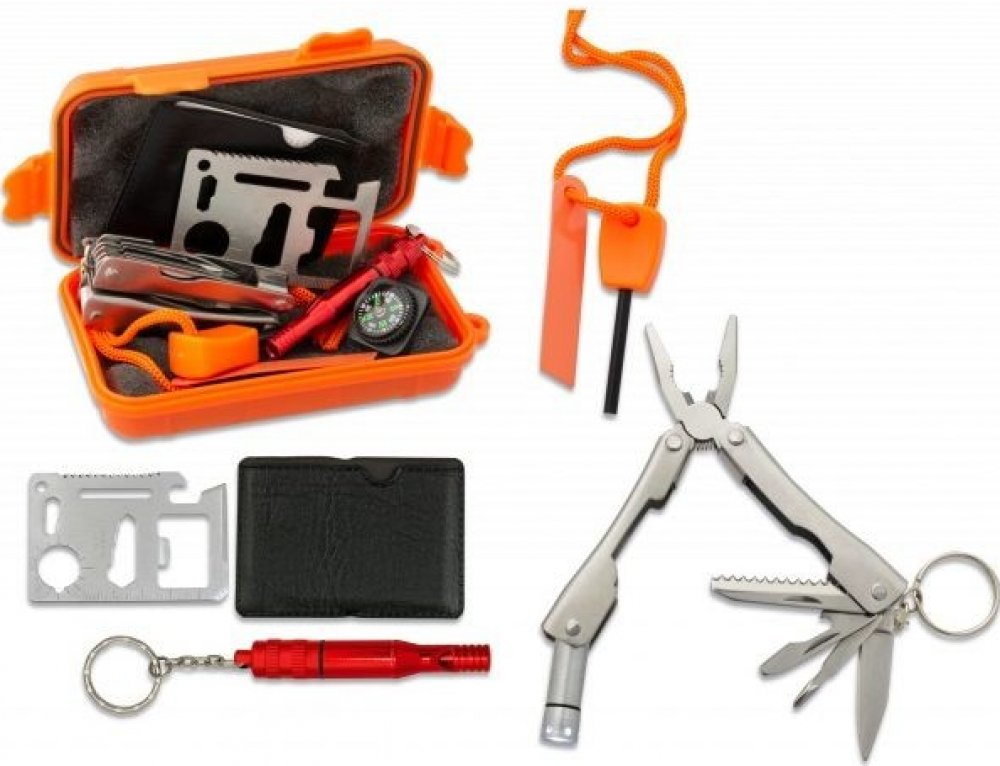 Sada obsahuje multifunkční nářadí - kleště, píšťalku, křesadlo, multifunkční kartu a kompas.