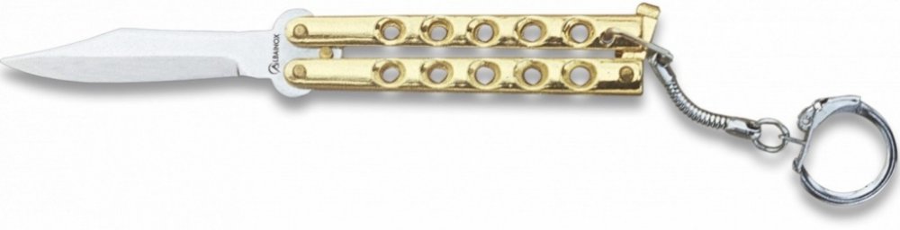 Kovový zavírací nůž, tzv. motýlek od španělské značky Albainox.Vlastnosti:• v malém provedení• s připevněním na klíče• otevřete ho (nebo zavřete) jednoduše překlopením dvoudílné rukojeti a zajistíte pojistkou na konci rukojeti