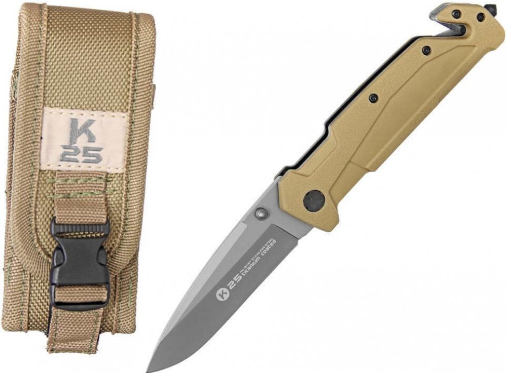 rukojeť je tvořena ocelovými příložkami na kterých jsou protiskluzové gumové střenky v khaki barvě a na konci rukojeti je řezač pásů a hrot na rozbíjení skla