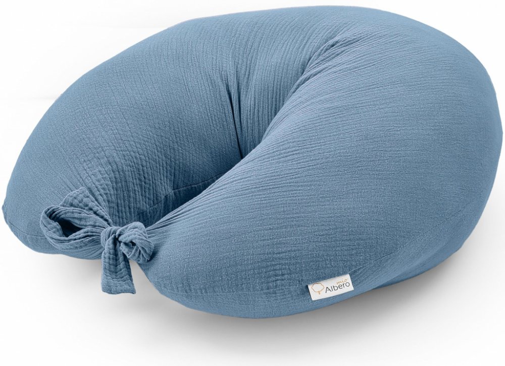 Mušelínový kojící polštář značky Albero Mio - barevné provedení (CC7) MODRÁ. Praktický pomocník při kojení nebo krmení z láhve. Kompaktní, středně velký polštář - vhodný na doma i na cesty. Bohatě naplněný kuličkami z dutého vlákna. Součástí balení 2 pratelné potahy. Rozměry: vnější obvod 155cm, vnitřní obvod 75cm.