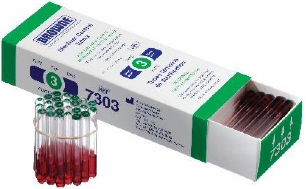 Test pro kontrolu účinnosti sterilizace proudícím suchým vzduchem dle vyhlášky MZČR č. 195/2005 Sb. slouží skleněné zatavené trubičky naplněné indikační tekutinou.