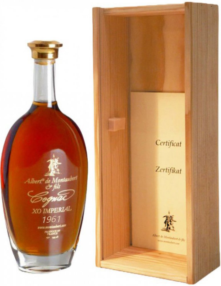 Cognac Albert de Montaubert ročník 1961 0,7 l Ročník 1961 z kolekce nádherných ročníkových koňaků Millesime Imperial od firmy Albert de Montaubert. Ročník 1961 je tvořen exkluzivně koňakem z vína sklizeného v roce 1961.
