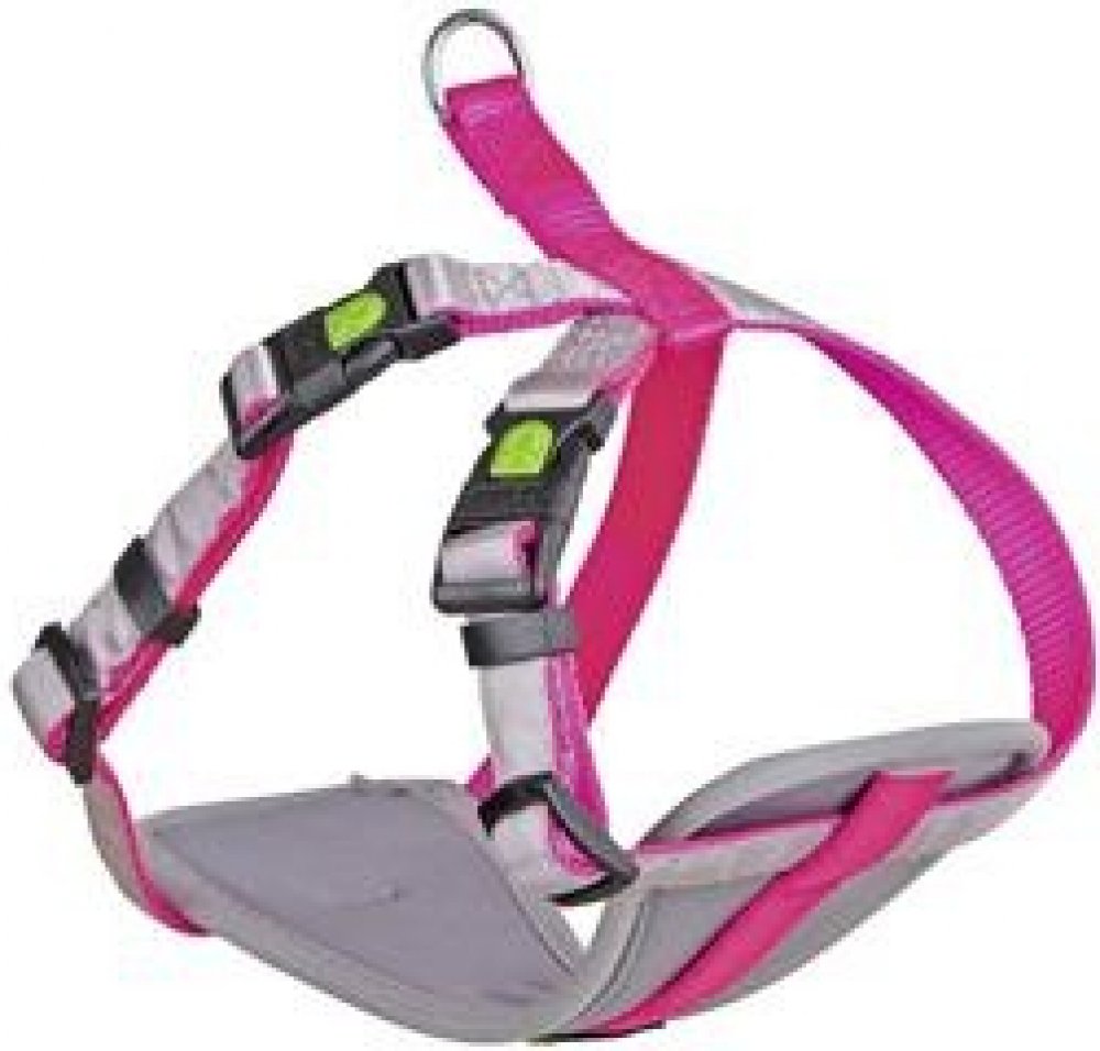 Postroj pro malé psy v moderních barvách. Polstrování v oblasti hrudníku, kvalitní nylonové popruhy, plynule nastavitelné očko pro uchycení vodítka