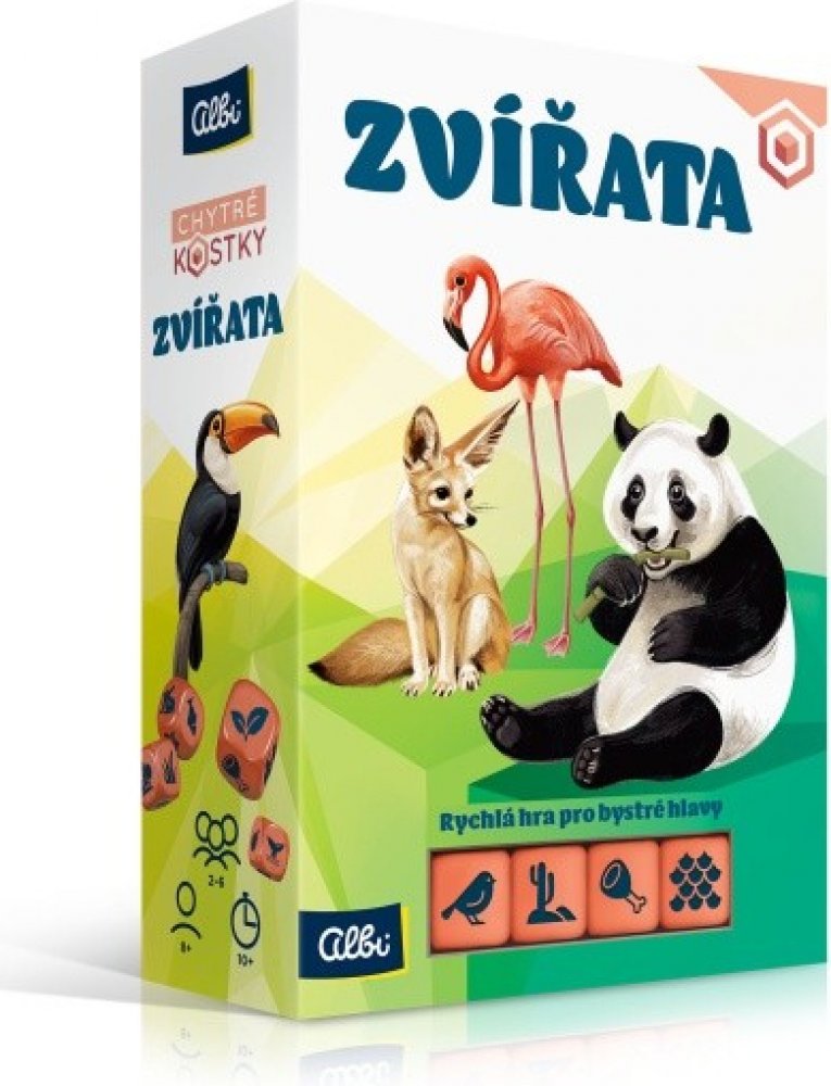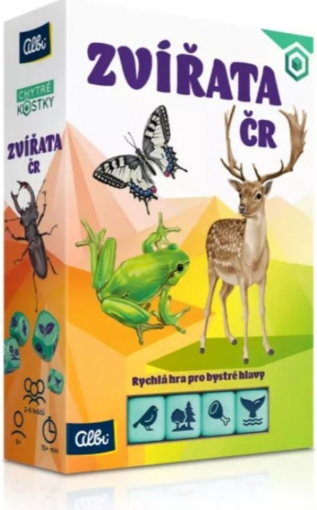 Chytré kostky - Zvířata ČR jsou vědomostně-postřehová hra s kostkami, ve které se hráči snaží co nejrychleji vybrat kartičku, která odpovídá parametrům hozeným na kostkách, např. váha, místo výskytu, potrava, apod. Podaří se vám propojit co nejvíce symbolů s některým zvířetem z vyložené nabídky karet? Uvažujte rychle, ať nemají soupeři šanci.