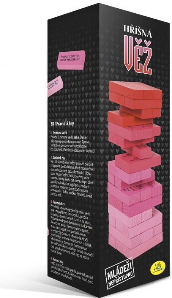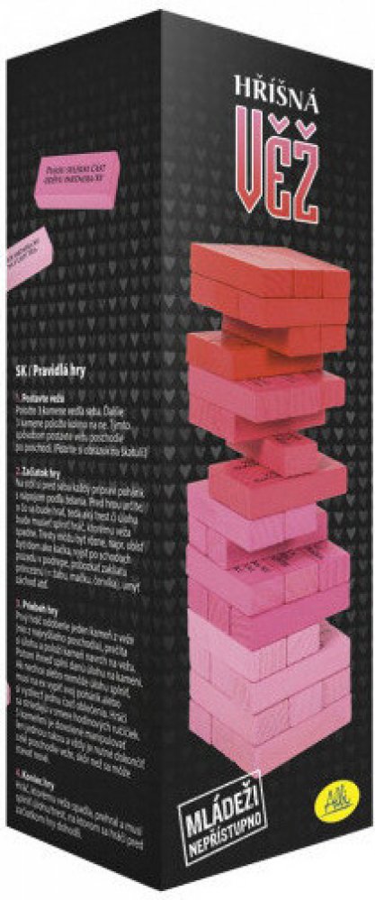 Hra pro dvojice nebo na odvážnou párty. Stavění věže dostane nový rozměr! Čím je tato dřevěná jenga zvláštní? Na herních kamenech se skrývají mírně lechtivé úkoly, které musí hráči ihned splnit. Pokud je nesplní, musí dát fant či vypít oblíbený drink. Pokud vám jenga věž spadne, čeká vás navíc speciální úkol určený na začátku hry.