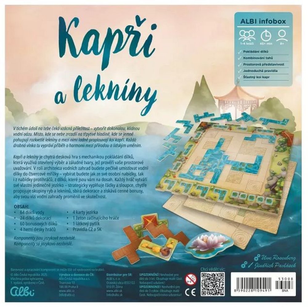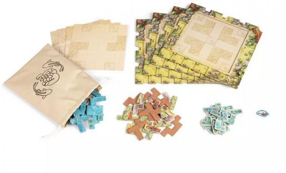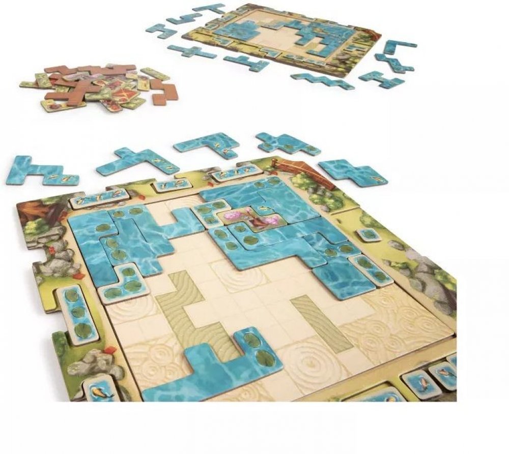 Vstupte do světa klidu a harmonie s hrou Kapři a lekníny, originální deskovkou od Uweho Rosenberga, tvůrce legendárních strategických her. Každý hráč vytváří na své desce vlastní okrasné jezírko, které zaplňuje dílky vody složenými z heptomin – tvarů ze sedmi čtverců spojených hranou.