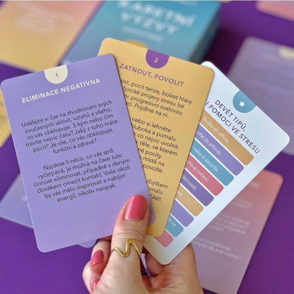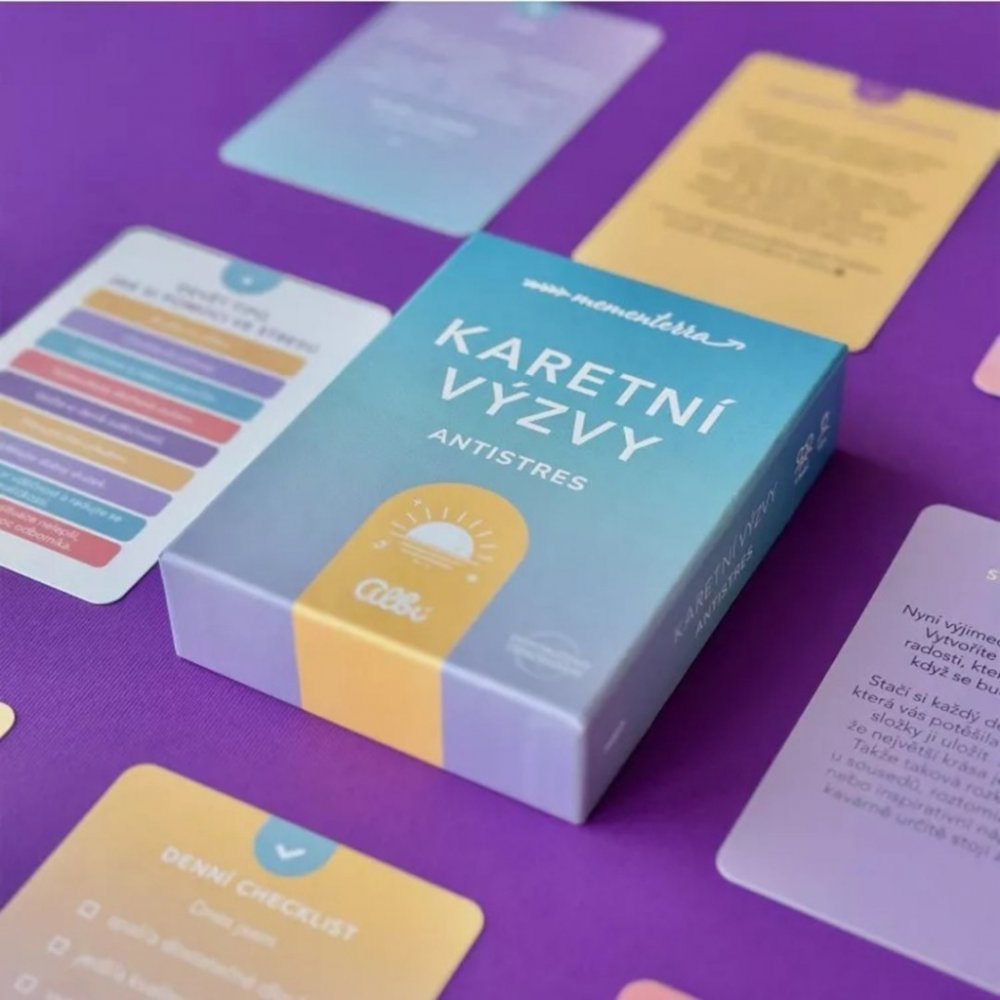 Pohyb, dechová cvičení, kreativní úkoly i vzdělávání. V tomto balíčku na vás čeká hned 50 karet, které vás provedou na cestě za radostnějším životem. Ať už vás trápí úzkost, stres, přepracování, nebo jen špatná nálada, vyzkoušejte tuto antistresovou hru, zaměřenou nejen na akutní stres, ale i na jeho prevenci. Výzvy tak lze používat jako rychlou antistresovou pomůcku, která vás provede účinnými a osvědčenými zklidňujícími technikami, ale i jako hravou formu sebevzdělávání a cesty za zdravými návyky.