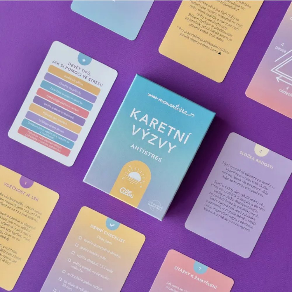 Rádce, průvodce i akutní pomocník, to jsou nové karetní výzvy proti stresu. Antistresové karetní výzvy z edice Mementerra jsou speciálně sestaveny tak, aby vám pomohly nejen jako prevence, ale také v akutních případech, kdy už vám stres, úzkost či strach přerostly přes hlavu.