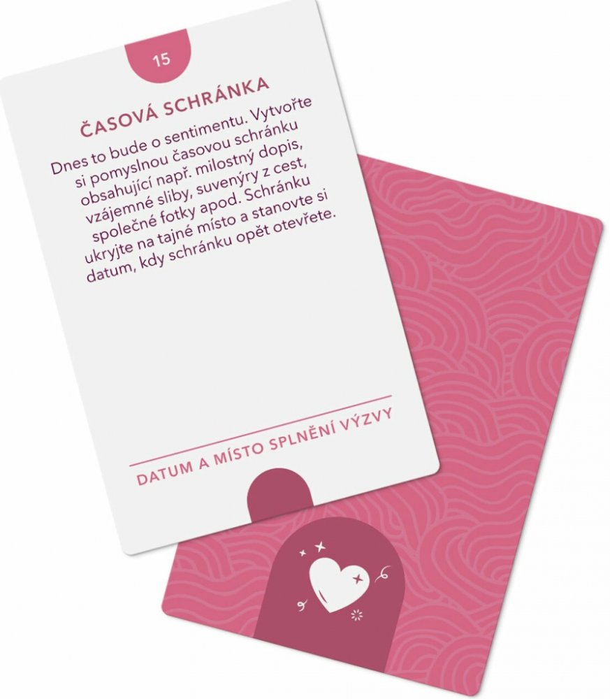 Balíček obsahuje 40 karet s výzvami určenými pro plnění v páru. Mějte však na paměti, že úkoly slouží k pobavení a sbližování. Pokud se komukoliv z vás do výzvy nechce, nenuťte se.